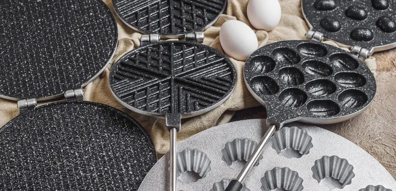 На формах для печенья, орешков и вафельниц используется антипригарное покрытие, наносимое методом напыления и усиленное сверхпрочными минеральными частицами, что гарантирует длительный срок службы даже при интенсивном использовании.