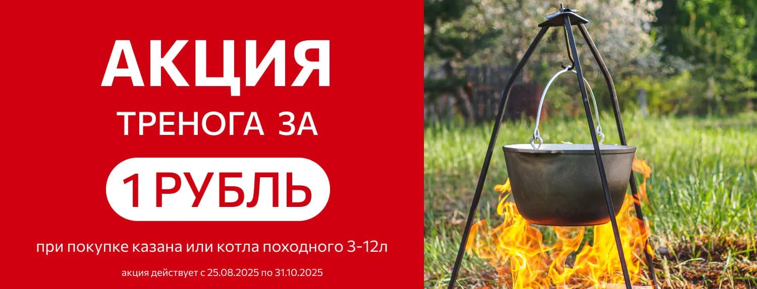 * Акция "Тренога за 1 рубль" действует при покупке одного казана/котла. Заказывая несколько казанов/котлов, вы получите одну треногу за 1 рубль ко всему заказу. Для получения треноги к каждому казану/котлу, оформите отдельные заказы.